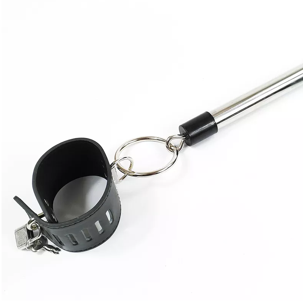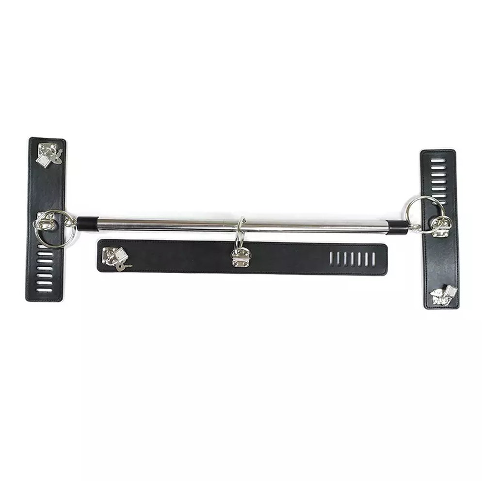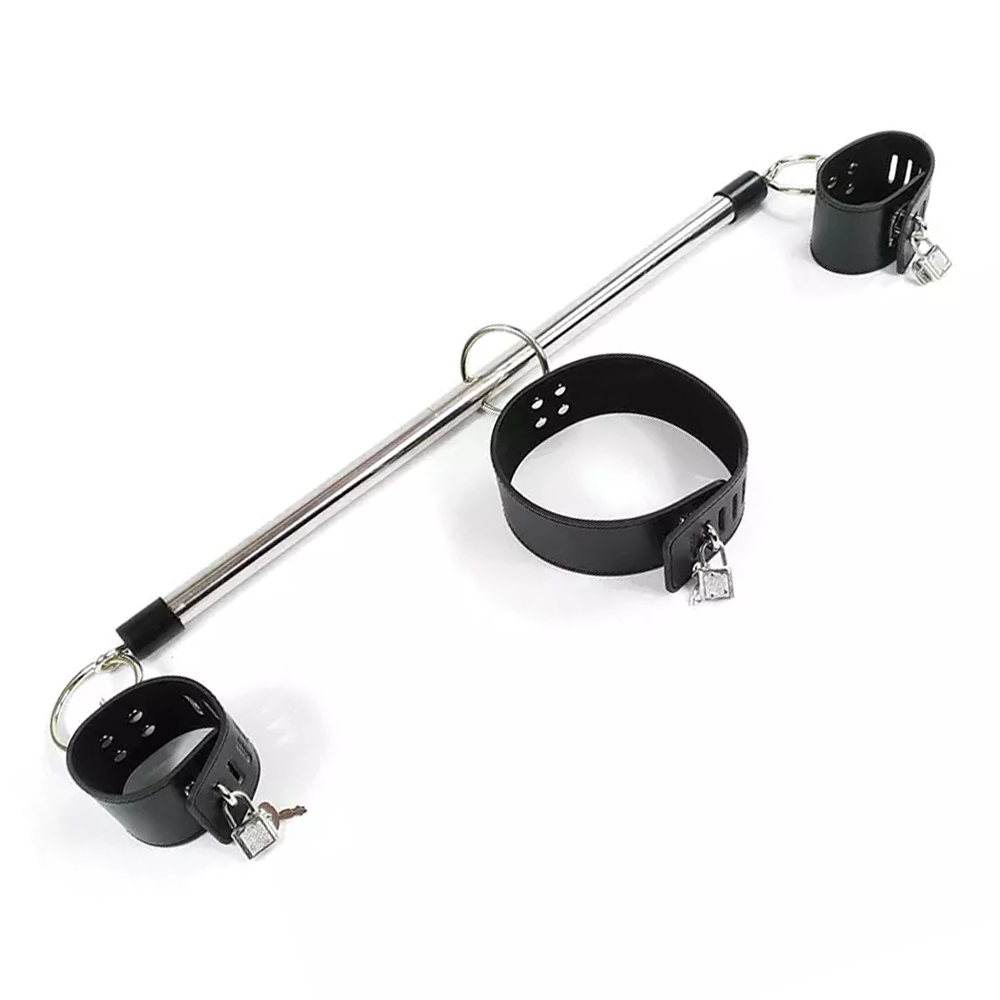 Relinquish control with this neck choker and wrist cuff spreader bar. Made from metal and cruelty free leather, this sturdy design will make you feel restrained completely by your master. Spreader bar includes an adjustable neck choker and wrist cuffs with locks.