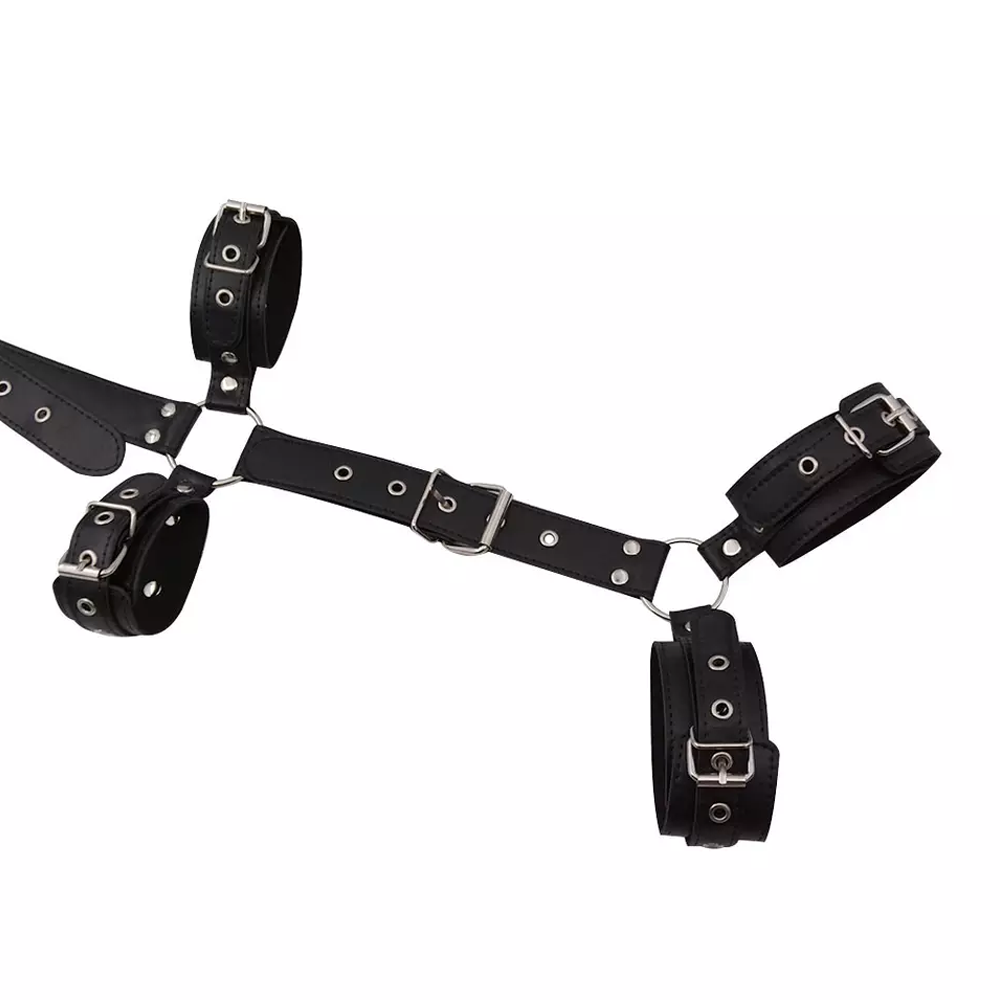 With this full body cuff set you can ensure your sub won’t be going anywhere. Enjoy the full control of your partner with adjustable neck, wrist and ankle straps connected to a full length cruelty-free leather strap running along their back.
