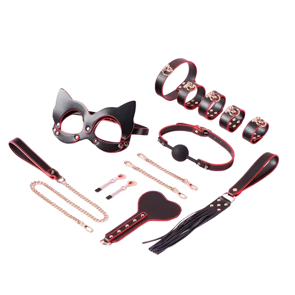 Get frisky with this 7 piece bondage kit, made with cruelty free vegan leather. This set of BDSM toys comes with a matching storage box and contains: