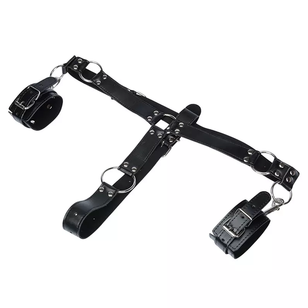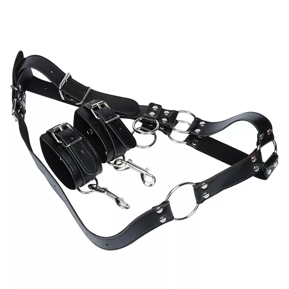Surrender control with this male restraint harness. Made from metal and cruelty-free leather, this harness makes it hard to escape. Harness comes with adjustable waist and wrist straps to help you get the perfect fit.
