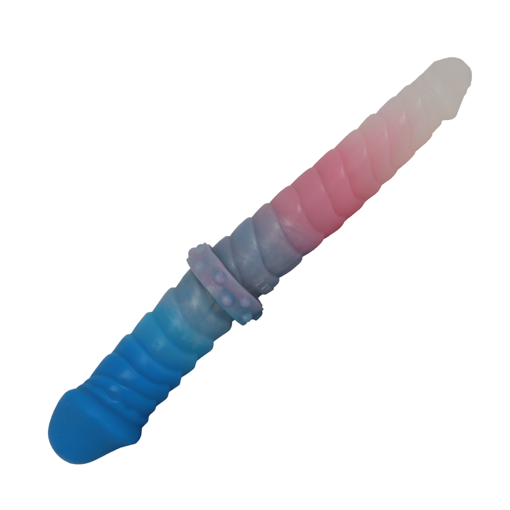 The Scaled Duo Dildo is a double ended dildo coloured in Faerie Floss, a cotton candy gradient. Both ends feature scaled ribbing to enhance pleasure, one of them being longer and thinner while the other end is shorter and thicker. This dildo is perfect for someone who wants a dildo that can satisfy them in more than one way, or for playing with a partner.